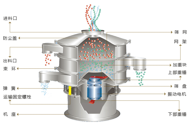 塑料振動篩采用YZUL立式振動電機(jī)作為激振源,通過振動電機(jī)上下兩端的偏心重錘將旋轉(zhuǎn)運(yùn)動轉(zhuǎn)變?yōu)樗?、垂直、傾斜的三次元運(yùn)動,并傳遞到旋振篩的篩面上;物料通過入料口進(jìn)入設(shè)備內(nèi),根據(jù)不同物料篩分要求,物料經(jīng)過1-5層采用不同目數(shù)的金屬編織篩網(wǎng)的篩分層,在這個過程中,位于各層的篩網(wǎng)下的清網(wǎng)裝置通過頻率振動不斷撞擊不銹鋼篩網(wǎng),使篩網(wǎng)上層物料能夠順暢的透網(wǎng)篩分,并有效解決了物料堵網(wǎng)問題出現(xiàn),不同目數(shù)的物料通過各層對應(yīng)目數(shù)的篩網(wǎng)后在各層的出料口排出,終實(shí)現(xiàn)篩選除雜或過濾分級的目的。