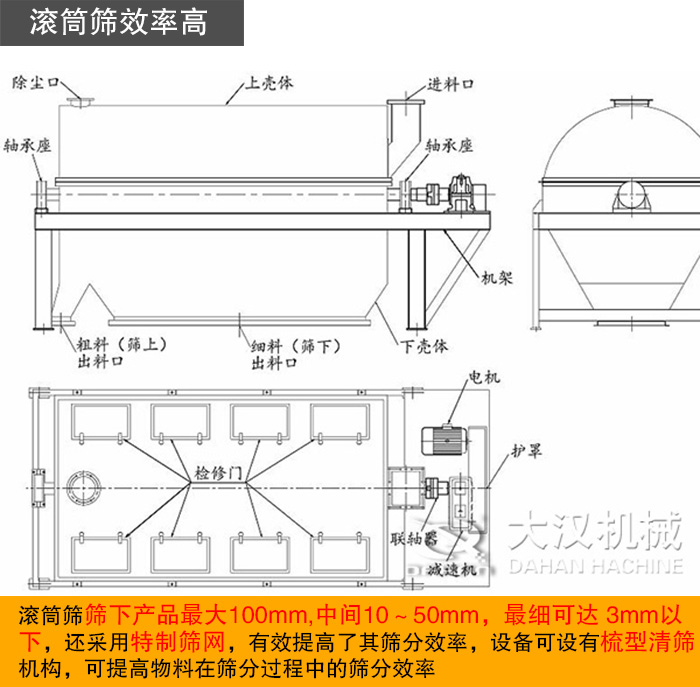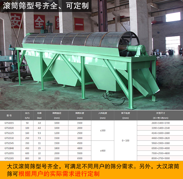 以上是新鄉大漢單臺滾筒篩價格介紹及分析,大漢技術人員免費為用戶提供滾筒篩選型、安裝、調試等指導,歡迎用戶前來咨詢或直接來廠參觀考察。