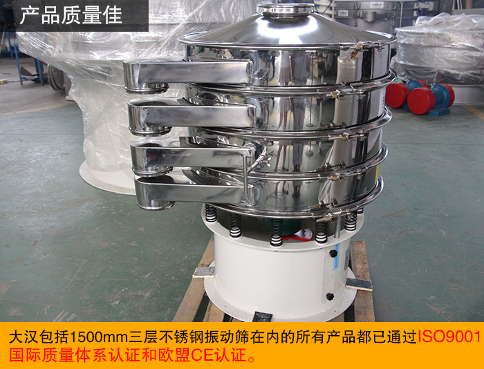 大漢生產出來的每一臺不銹鋼振動篩均采用先進的生產工藝、精湛的焊接工藝制造而成,大漢從選材的精良,到技術的革新,再到做工的精湛,再到成品的嚴格檢查,對每一環節都牢牢監控,。目前,大漢包括1500mm三層不銹鋼振動篩在內的所有產品都已通過ISO9001國際質量體系認證和歐盟CE認證。
