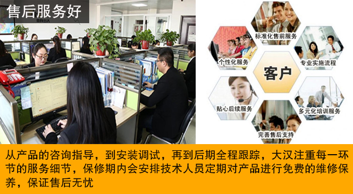 大漢公司采用一站式服務體系,從產品的咨詢指導,到安裝調試,再到后期全程跟蹤,大漢注重每一環節的服務細節,致力于為客戶解決一切疑難問題,保修期內會安排技術人員定期對產品進行免費的維修保養,保證售后無憂。