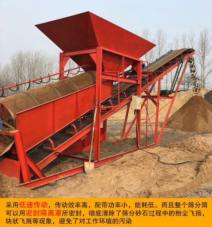 砂石滾筒篩整機運行安全可靠,采用低速傳動,傳動效率高,配帶功率小,能耗低。而且整個篩分簡可以用密封隔離罩所密封,清除了篩分砂石過程中的粉塵飛揚,塊狀飛濺等現象,避免了對工作環境的污染。