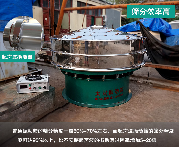 篩分效率高:由于加裝了超聲波換能系統,可以有效分解粘附物質,減少篩上物,普通振動篩的篩分精度一般60%~70%左右,而超聲波振動篩的篩分精度一般可達95%以上,比不安裝超聲波的振動篩過網率增加5-20倍。