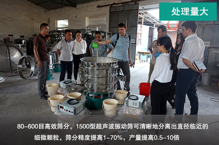 處理量大:80-600目高效篩分,1500型超聲波振動篩可清晰地分離出直徑臨近的細微顆粒,篩分精度提高1~70%,產量提高0.5-10倍。