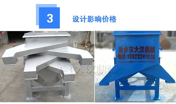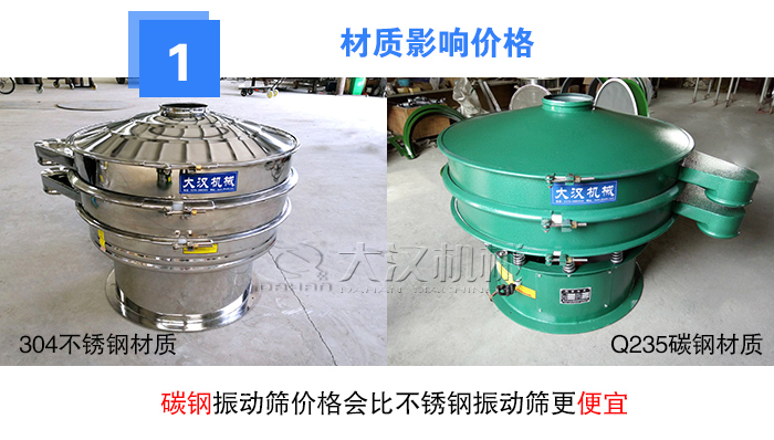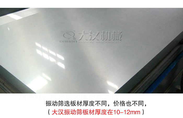 振動篩材質一般分為Q235碳鋼材質與304不銹鋼材質(也有使用316L不銹鋼),選用不同材質的振動篩,其價格是不同的,碳鋼振動篩價格會比不銹鋼振動篩更便宜,而且振動篩選板材厚度不同,價格也不同,板材足夠厚,篩機使用更長久(大漢振動篩板材厚度在10-12mm)。