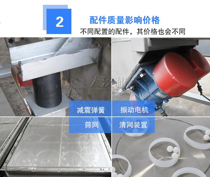 振動篩配件主要有振動電機、減震彈簧、篩網、清網裝置組成,選擇不同配置的配件,其價格也會不同。
