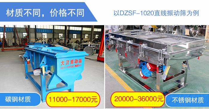 直線振動篩材質分為碳鋼和不銹鋼兩種材質,碳鋼沒有特意添加合金元素的鋼材,不銹鋼是為了防銹而添加高合金含量的鋼材,碳鋼通常比不銹鋼的強度更高,但容易生銹,所以碳鋼材質的直線振動篩會比不銹鋼材質的更加便宜。關于直線振動篩材質的選擇,主要由物料篩分環境進行選擇。以DZSF-1020直線振動篩為例,碳鋼材質的價格在11000-17000元之間,不銹鋼材質的價格在20000-36000元之間。
