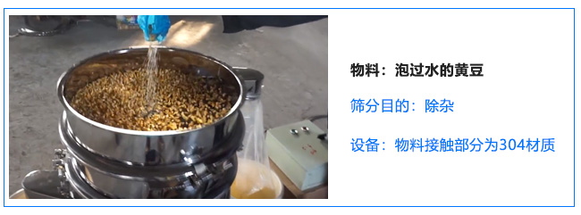 客戶三:要一臺旋振篩與物料接觸部分要304材質,用于篩泡過水的黃豆,除雜用,把黃豆里面的小石子和細沙過濾掉