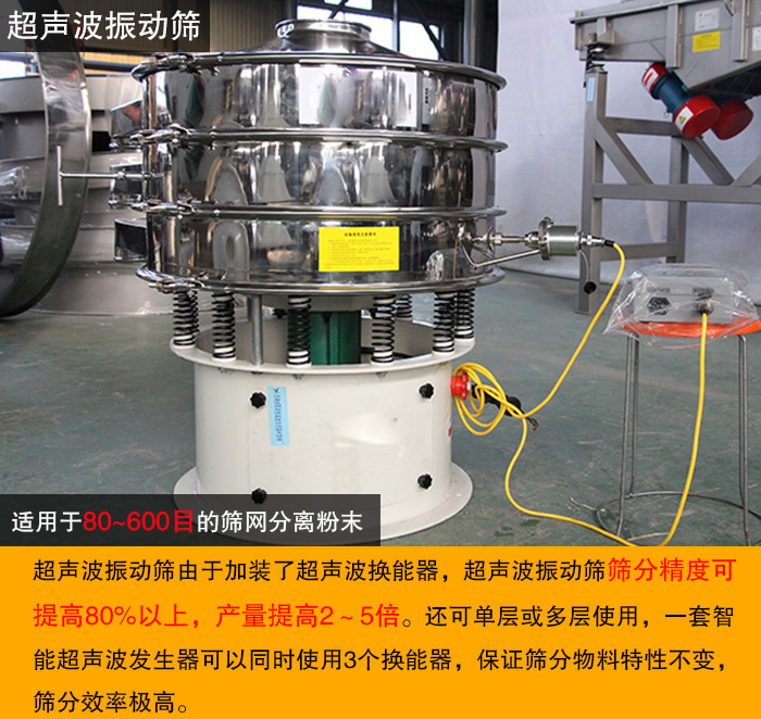 超聲波振動篩由于加裝了超聲波換能器,超聲波振動篩篩分精度可提高80%以上,產量提高2~5倍。還可單層或多層使用,一套智能超聲波發生器可以同時使用3個換能器,保證篩分物料特性不變,篩分效率極高。